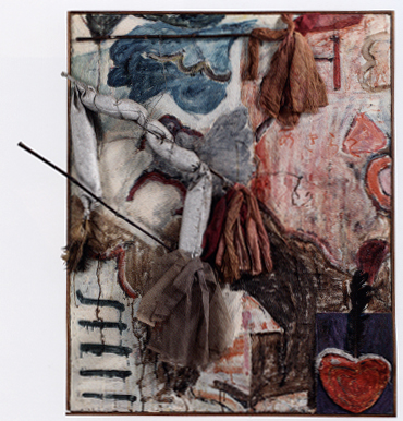 加えて、具象的主題に結び付きやすい文字や記号、数字を放棄しないのは、後に荒川修作が1963年から1980年代末まで続ける〈意味のメカニズム〉*3と同様に、ポスト・モダニズムの先駆とも言えるジャスパー・ジョーンズの考える三次元絵画、オブジェ化した絵画も視野にあったのかもしれません。奇しくもネオ・ダダからポップ・アートへと進んだジャスパー・ジョーンズ、そして1960年に「ネオ・ダダイズム・オーガナイザーズ」を結成した荒川修作同様、田畑あきら子もネオ・ダダ作品そのものともいえるコンバイン・ペインティングによる《作品》(1966年頃、ヒロセコレクション蔵)*4を制作しています。
