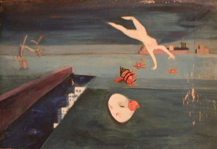 作品のタイトルは抽象的な語彙ですが、表されているのは、一つ一つがリアルなモチーフです。ヒトデや貝から類推して海辺の風景だと思われますが、海中都市のような建築群が見えています。沈んだ群青の空間を鮮やかな白い裸体が落下していくという異様な光景が描かれています。30年代の作品という意識で観ると、不穏な深層心理を表現したものとも感じられてきました。絵具の剥落がひどく壁面の展示に耐えるかどうか危ぶまれましたが、今回のテーマに最も合致するこの作品を展示しないという選択肢はなく、リストに加えました。